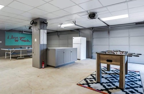 - game room with ping-pong and foosball tables, shuffleboard, dartboard, two 75" smart tvs, and lounging zone