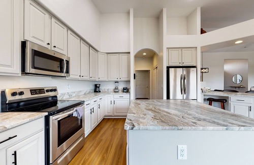the recently renovated kitchen is well-appointed with stainless steel appliances, an island, and thoughtful conveniences to make your stay effortless You’ll also find shampoo, hair dryers, an iron, laundry soap, and other small essentials—items you might not want to pack or purchase—ensuring a worry-free experience.