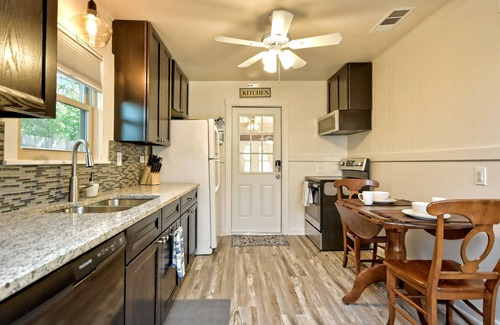 Looking for accommodation near downtown New Braunfels? Look no further than Opa Seidel's Haus! This charming 1940s-era cottage is situated directly across the street from Schlitterbahn and just one block from the Comal River, making it the perfect spot for a fun-filled vacation. You can spend your days floating down the river and then relax back at the house, or head to Schlitterbahn for a day of excitement, come back for lunch, and then head out again for more fun in the sun. The house is fully furnished with linens, towels, cooking utensils, a washer/dryer, and wireless internet. In the living room, you can watch your favorite movie or sports team on the TV. The kitchen is fully equipped with all the cooking supplies, from bowls to utensils. Or, if you prefer, you can choose to barbecue outside on the charcoal grill. The house can comfortably accommodate up to six people, with two cozy bedrooms, each furnished with a Serta iComfort queen-size mattress and a sleeper sofa in the living room.