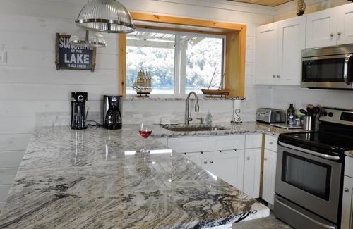 When you arrive at Water's Edge you will not want or need to leave. We offer a Pontoon boat rental from May to October that can stay at the house overnight/s and you can use at your leisure with no trips running back and forth and wasting precious vacation/boating time. This house is as close to the water as one can get. We have been VRBO property owners since 2014. This property is a Beach Style Lakefront home with double slip dock. The gentle slope of the patio walk to water provides an easy walk to the Waters Edge. The house has 2 bedrooms with independent Mini-split AC. Master Suite has a King Bed with full bathroom with step in shower. 2ND Bedroom has 1 Queen bed and a set of bunk beds with Ensuite full Bathroom with step in shower. All of our beds are very comfortable and after each guest leaves every piece of linen, every blanket, every quilt or bedspread is washed and fresh especially for you. We also have a 3rd Full Bath on the ground floor with step in shower. This house will sleep 6 comfortably in beds and if you have some young ones to sleep on the large comfy sectional there is space enough for 2 smaller humans.