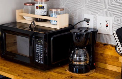 kitchen: features a microwave , plenty of counter space, a sink (no dishwasher), a fridge, coffeemaker The kitchen is equipped with all the basics to cook a full meal, as well as 2 place settings. Coffee, creamer and sweeteners. A charcoal grill is also provided outside for guest use.