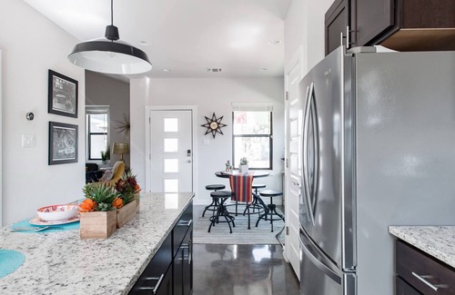 enter this newly built home and marvel at the charming local décor, high ceilings and beautiful spacious rooms! rest your tired legs on the sofa or armchairs as you watch the flat-screen tv in the living room Relax on the back terrace and fenced-in lawn, or sit on the front porch and chat with the friendly local neighbors. Talk about the fun plans you have for your San Antonio stay over breakfast at the kitchen island or dining table. Walk to the Dignowity Hill Farmers Market just blocks away, go have a fantastic coffee at Estate, or go to enjoy a delicious meal or a drink at Dignowity Meats. Whip up a tasty snack in the kitchen with new stainless-steel appliances. Rent bikes and go for a ride to Hays Bridge to watch the stunning sunset over the magnificent view. As the day comes to a close, retire to the cozy bedrooms for a night's sleep.