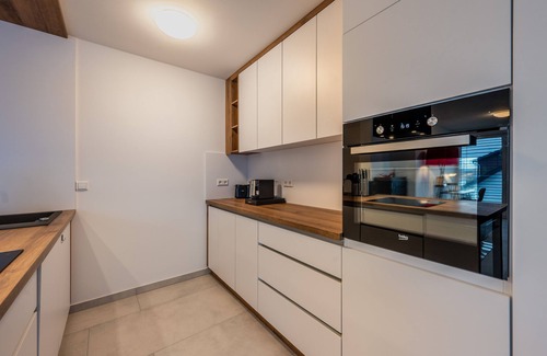 Enjoy a stylish experience in the centrally located luxury accommodation with a fireplace and a huge covered balcony. Perfect for business travelers and families. Our luxurious and modern furnished 2-bedroom apartment in the downtown of Böblingen with an open floor plan and bright rooms, which make this apartment an exceptional place. We offer a great and open kitchen with cooking island, a king-size bed and a high-quality leather couch with sleeping function..
