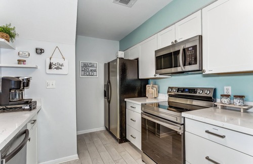 the kitchen, equipped with all stainless-steel appliances, is a culinary haven An island with four bar chairs creates a central hub, ideal for casual meals or enjoying morning coffee. Keurig or drip coffee maker available.
