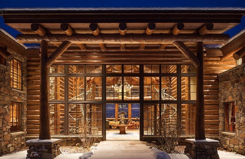 phillips ridge sits high atop a rocky ridge overlooking jackson hole Below, the wide valley rolls away for miles upon miles. A long driveway, bordered by streams and shadowy forest, winds its way up to the house, a magnificent Western lodge made of wood, solid stone and ethereal glass. Palatial, sumptuous, and filled with splendid works of art, Phillips Ridge begins with a two-story, light-filled entryway. Thick log walls and tree trunk supports contrast with fine antiques and soft, rich fabrics. The living and dining areas are divided by a massive two-sided stone fireplace and illuminated by a 40-foot-high wall of windows. Painter Bo Bartlett created a huge, stunning canvas in oil called “Goddess” – spanning an entire wall.