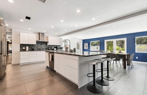 the modern kitchen is equipped with high-end appliances, including a bosch double oven and dishwasher, an lg cafe refrigerator and cooktop, and a microwave It comes fully stocked with cookware, utensils, dinnerware, and glassware.