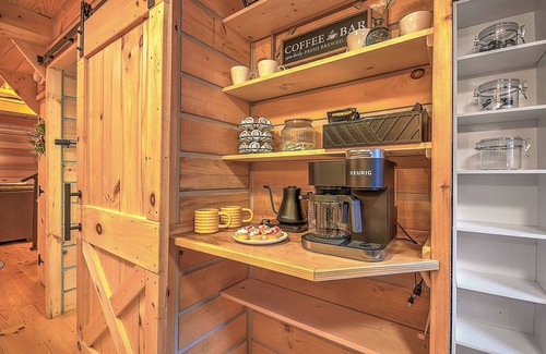 This stylish and luxurious cabin offers peace and beauty in the foothills of East TN. The lower level has a gaming area complete with horseshoes, corn hole and seating for eight by the firepit. A 30-foot water feature cascades onto the gaming area. A perfect way to end the day after a hike or day on the lake. The outdoor patio with gas grill is perfect for an easy dinner at home. Just minutes from Watauga Lake and Laurel Falls. East Tennessee has so much to offer for an adventure or just relaxing in nature..