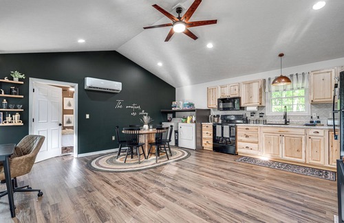Modern and newly renovated cabin outfitted for families and pets featuring a playground, fire-pit, and BBQ under outdoor market lights. Tucked in a cul-de-sac situated on 1 acre of flat land; walkable to South Fork River for fishing/kayaking. Near Skyline Drive, Shenandoah National Park, Luray Caverns & Massanutten Resort. Sleeps 6 adults comfortably or up to 8 with children..