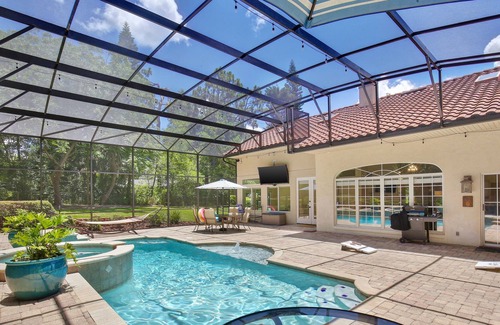 Welcome to your home away from home, nestled in a beautiful neighborhood outside of Orlando, FL. The gorgeous exterior greets you with a spacious yard full of manicured landscaping and palm trees, a Spanish style roof and lovely brick. This stunning vacation destination offers a saltwater pool and heated spa along with tons of activities for the family—play a game of pool, foosball, ping pong, Lego Rock Band, basketball, or cornhole. Inside you’ll find an open and airy space with elegant finishes and vaulted ceilings. Enjoy a family movie night in the spacious living room, host a home cooked meal in the dining room that seats 8, and play your favorite games on the Xbox.
