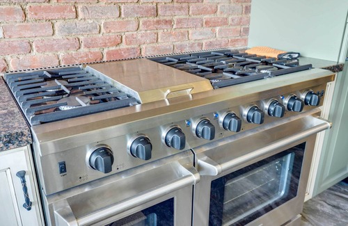 kitchen: fridge, 6-burner stove w/ griddle, double oven, dishwasher, microwave, coffee maker, blender, ice maker, water filter, cooking basics, dishware & flatware, spices, trash bags, paper towels