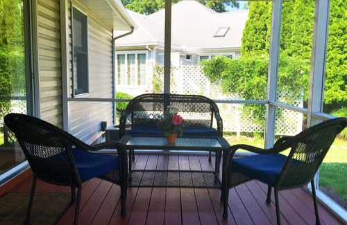 • screened porch: 10 x 10 ft space with seating for 4, plus a small table for 2 – perfect for morning coffee, with a ceiling fan for comfort