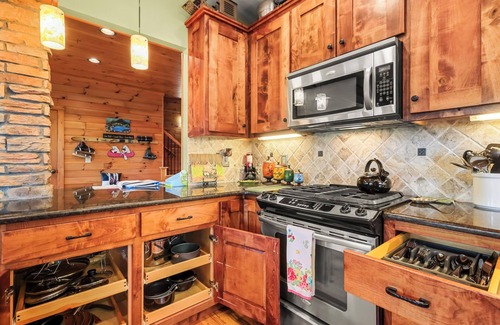 our home has granite counter tops, stainless appliances, gas fireplace, beautiful wood throughout home, large deck and also a lower patio over looking mountains, a stone and wood covered entrance way Satellite, internet, free wi-fi, home phone, and 5 HDTV's.