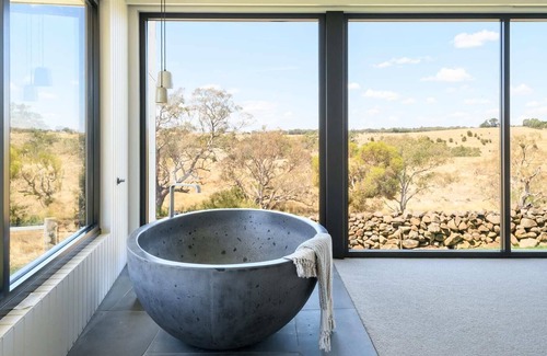 a sprawling well-equipped fully integrated chef's kitchen and butlers pantry allow guests to indulge in delicious home-cooked meals made from fresh, locally-sourced ingredients, while multiple indoor and outdoor dining areas provide space for all guests to gather together and enjoy time together no matter what the weather Generously sized bedrooms, floor-to-ceiling windows with spectacular country views, a large stone egg bath, hydronic heating, split system AC, complimentary WIFI, and loads of other features come together to provide visitors to Fassway Farm a balance of style, function, luxury, and tranquility; creating a truly unique and unforgettable experience for those seeking a special retreat in the heart of rural victoria.