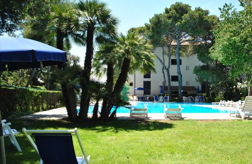 customers can enjoy private parking spaces, swimming pools, a large park with very tall pine trees, private gardens, a walkway to the beach, beach chairs and sun loungers