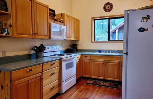 inside fawn creek hideaway you’ll find a fully equipped kitchen stocked with cookware, spices, a dishwasher, microwave, 3 types of coffeemakers(standard drip, french press and pour over coffee option, coffee grinder provided as well), tea lovers have a tea kettle, electric kettle and loose leaf tea leaves holder . A sunny enclosed breakfast nook and open living room with a gas fireplace create a welcoming space to relax.There is a laundry room with washer/dryer and a bathroom with walk in shower(shampoo conditioner and bodywash provided) The upstairs bedroom, perched among the trees like a private treehouse, features a queen bed and ensuite bathroom. Downstairs, another queen bedroom with sliding glass doors opens onto the deck. For extra guests, a queen sofa bed is available in the living room. The cabin also includes a Smart TV (Netflix, YouTubeTV, and more—use your own login), a Bluetooth speaker, radio, and high-speed internet.