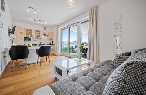 this bright and modern holiday apartment welcomes you with a pleasant ambience, in which tasteful furnishings and plenty of natural light create a real feel-good atmosphere Floor-to-ceiling windows open up an enchanting view of Lake Wörthersee. Look forward to harmonious meals at the inviting dining table and make yourself comfortable on the sofa for a film evening after an active day in the great outdoors.