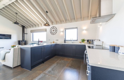 inside fern, the single-storey, open-plan accommodation is light and spacious with cosy under-floor heating throughout, provided by an eco-friendly ground source heat pump Cook up a delicious meal made with fresh, local ingredients in the modern and well-equipped kitchen, and then snuggle up around the wood burning stove. Open the bi-folding doors and relax in your very own wood fired hot tub. Outside, along with the hot tub is the terrace and garden where you can soak up the sunshine and take in those wonderful views.