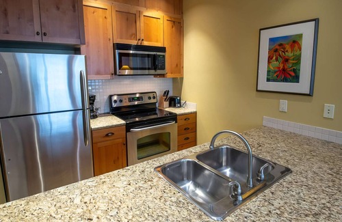 Bring the whole family-even the dog-when you visit Fernie and stay in this stunning 2 bedroom, 2 bathroom suite inJuniper Lodge. This suite features granite counter tops and stainless appliances in the full kitchen as well as an open living room with flat screen TV, electric fireplace and leather couch. The 2 bedrooms are fitted with high quality linens, with 2x twin beds in the first bedroom and a queen in the second, there is also a sofa pullout in the living room. There is free wifi, washer and dryer and a private balcony to make you feel right at home, in the heart of the Rockies! The condo is situated within walking distance of the chairlifts and base area at Fernie Alpine Resort.