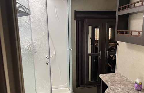 Beautiful fifth wheel camper. Go camping with out the hassle of camping. Great town of cimarron New Mexico sleeps 4 comfortably. Creek on property,campfire,beautiful mature trees and grounds ,recreation room with foosball and air hockey near philmont boy scout ranch..