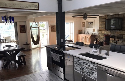 private waterfront oasis WITH POOL. Open sunny floor plan. Huge master with bathroom, cathedral ceilings and French doors to yard. And pool. Your private BBQ, vegetable garden you can pick and cook. .