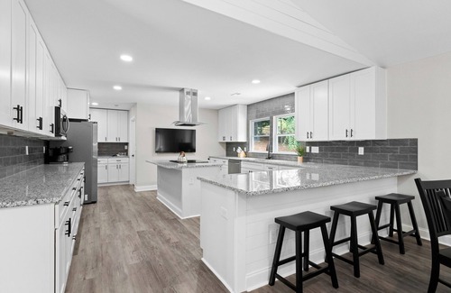 thoughtfully updated from top to bottom, this modern ranch with a fully finished basement was made with entertaining in mind The main level greets you with an open-concept living space where the kitchen, dining area, and living room flow seamlessly together. The fully stocked kitchen is a dream for home chefs, featuring all the tools you need to prep meals for the whole crew. While meals are cooking, guests can pull up a seat at the kitchen island, which offers seating for four and lake views to match.