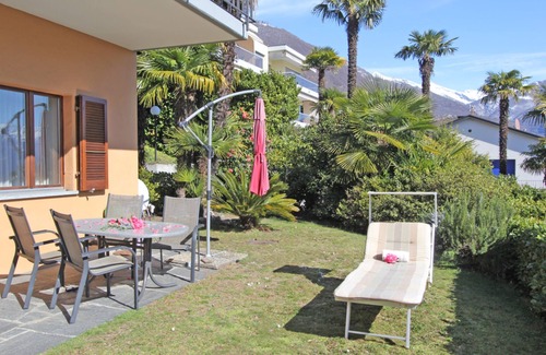Locarno-Monti lies above Locarno on the sunny hillside. The small residence with only 6 residential units is located in a sunny position with a beautiful view of the lake and the surrounding mountains. Lake-side garden with palm trees and Mediterranean shrubs, lawn and covered terrace with garden furniture for private use. Driveway until house. Reserved, open parking space. Elevator. Bus and shops about 200 m. Lake promenade, train station and center of Locarno with large shopping possibilities about 3 km. Lido Locarno about 4 km. Bed/kitchen linen available. Washing machine for shared use. Pets up to max. 15 kg permitted.