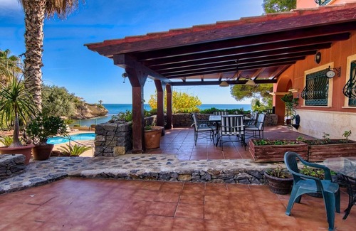 Situated in Coveta Fuma, 2 Km from Campello and 16 Km from Benidorm. For those NOT WISHING TO USE CAR the villa is 1 minute walking from the local electric tram station, the tram goes from Sunrise villa to Campello on to Alicante and in the other direction along the coast wich gives access to the beautiful and varied coast line of this area, Alicante city, Benidorm and the magnificent San Juan Beach . The villa is comprissed of 4 double rooms with 4 twin beds and 2 kingbed, able for 8 persons plus a cupboard bed placed in groundfloor lounge, able for 2 more adults, (occasionally we can also provide 2 extra individual sofa bed, able for 2 more children); 1 en suite bathroom and 3 complete bathroom with shower, 1 independ0ent whirpool bath (jacuzzy), laundry room, 2 large complete fully fitted kitchen with fridge freezer, owen, microwave, diswasher etc., 1 LIFT PROVIDING WHEELCHAIR, OR ELDERLY ACCESS, 2 large lounge, one in the basement and the other one in first floor, with TV (Including all european football leagues free matches live (U.K, Germany, Italia, France, Spain etc.) and Champions league, worldchampionship etc. , DVD, CD player etc., gas central heating, private swimming pool , private car park inside, BBQ, 3 large covered terraces facing the sea and 800 spq. m. private gardens with palm, olive, pine trees and hundreds of tropical flowers..