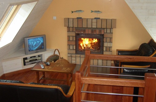 on the floor is the room of life with done up kitchen, corner meal and living room with chimney, tv, dvd, cd This living room gives directly onto the terrace with a table and chairs, 2 wooden sunbeds with cushions, 1 beach cabin for storage, the other with freezer. barbecue