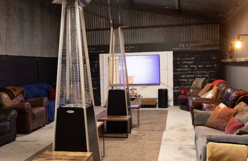 our two entertainment barns are perfect for gatherings, featuring karaoke, a cinema area, fire pit, table tennis, a bar area with fridges, a living room, spa hot tub, and bbq area join us for an unforgettable stay!