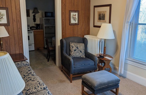 comfortable living room, equipped kitchen , library/computer room and twin beds for the bedroom You can have coffee on the attached porch overlooking the woods. Later walk downtown through the Victorian neighborhood and enjoy the homes and gardens. Only four small blocks to downtown to shop, eat, and enjoy the ambiance and friendliness of a thriving downtown, You will be glad you stayed and we'll be glad to meet you..
