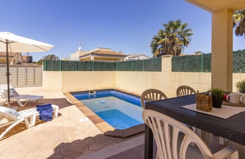 Urb. Riumar 8 km from Deltebre: Cosy, comfortable house "Flamenc 2", built in 2007. In a quiet, sunny position, 1 km from the sea, 1 km from the beach. Private: property (fenced), swimming pool angular (6 x 3 m, depth 170 cm, seasonal availability: 01.Jan. - 31.Dec.). Outdoor shower, terrace, garden furniture, barbecue. In the house: WiFi, air conditioning, washing machine. Parking on the premises. Supermarket 500 m, restaurant, bar, bakery 100 m, bus stop "Riumar" 100 m, railway station "Aldea- Amposta" 25 km, sandy beach "Riumar" 1 km. Nearby attractions: Parque natural Delta del Ebro 2 km, Tortosa 35 km, Playa el Trabucador 29 km, Barcelona 190 km, Port Aventura 70 km. Hiking paths: Parque natural Puerto Tortosa Beseit 52 km, GR 92 15 km. Please note: car recommended. Groups of teenagers on request only.