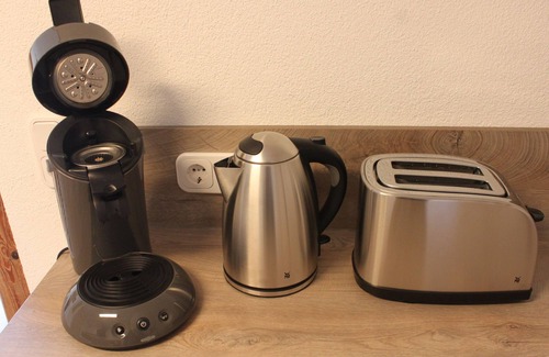 the bedroom is furnished with a double bed (180 cm, 2 separate mattresses, adjustable slatted frames) and a wardrobe The living and dining area is equipped with a smart TV and a comfortable sofa bed. The open, fully equipped kitchen (including dishwasher, Senseo pad coffee machine, toaster, kettle) is located in the entrance area of the holiday flat. The bathroom with walk-in shower, washing machine, hairdryer and towels can be reached via the open living area.