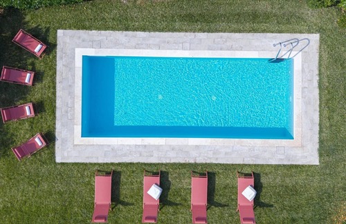 surrounded by open gardens, the villa blends seamlessly with the natural beauty of the countryside Instead of umbrella sunshades, mature trees provide dappled shade, allowing guests to relax comfortably by the pool while taking in the sweeping views of farmland, vineyards, and olive groves. Various natural shaded areas around the property offer peaceful spots to unwind, whether enjoying a quiet moment with a book or gathering for an alfresco meal.