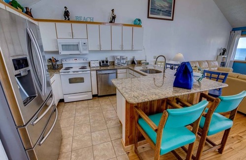 Have a stress free and easy vacation at 'Footloose'! Enjoy your own private pool on the oceanfront and great views from the top level Great Room and decks. Pine floors, granite, stainless steel appliances and beachy cottage décor invite you to kick off your shoes and get your feet wet. Everyone can relax by the private pool for the big kids, and there is also a kiddie pool for tots! Beach time is easy with your own walkway to the beach. The spacious Great Room has panoramic views of the beach and ocean to enjoy. Your family will love the ambiance and relaxing feeling throughout the property as you unwind and bond together at the beach. The kitchen is well-appointed and filled with everything you need to plan and prepare meals for your family. Like to cook out? The 10' long picnic table and spacious grilling area make it easy for the whole family to enjoy your grilled masterpieces and picnic every night! There is plenty of seating around the pool too.