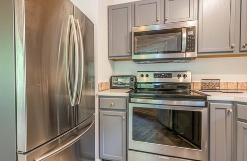 enjoy sipping wine and casual conversation overlooking your very own forest Relax on a comfy sofa gazing onto a distinctive slate gas fireplace in the living room or turn your gaze to the expansive windows highlighting phenomenal 🌳forest views. Luxuriate on a 🛏️Queen pillow top bed, featuring luxury linens and comfy pillows. Prepare a meal in our fully stocked stainless steel kitchen which includes five burner electric oven, microwave, toaster, refrigerator, utensils, cookware & Keurig. Full bath w/slate shower, oversized showerhead, plush towels.