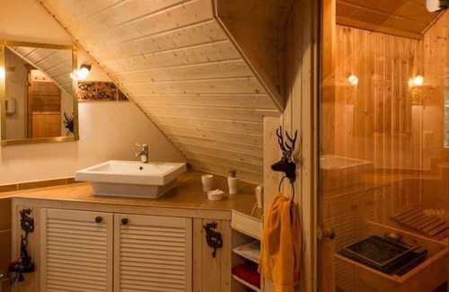 holiday apartment wald-blick has a size of 65 square meters Sauna integrated in the bathroom, cozy kitchen-living room with seating area, sofa and reading area by the window, kitchen area is equipped with a 4-plate stove with oven, sink, refrigerator, microwave, toaster, kettle, coffee machine, radio/SAT TV. WIRELESS INTERNET ACCESS There is a reading island (bed) under the slant for a cozy reading hour. Large bedroom with a romantic white prince bed (double bed), room has double height, large wardrobe, chest of drawers, bedside tables. The holiday apartment is on the 1st floor. There is also a beautiful shower room with an additional sauna area and a toilet. The view from the windows of the bathroom area is of the treetops of the forest.