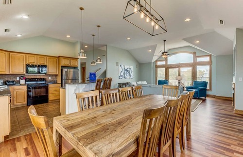 top-level: living room with smart tv, fireplace (gas), additional table (seats 2), and deck access; loft with workstation; dining room with table (seats 10); kitchen with bar (seats 4), blender, coffee maker (drip & keurig), 2 dishwashers, microwave, oven/stove, refrigerator, toaster, pots, pans, dishes, and cooking essentials; king master bedroom with smart tv, deck access, and attached full bathroom with tile shower and whirlpool tub; king master bedroom with smart tv and attached full bathroom with shower with seat; hall half bathroom