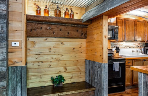 Experience Foxwood Cabin’s unique artisanal craftsmanship designed for your mountain getaway! Enjoy the rustic, yet modern construction, featuring natural wood walls, barn style doors, tin ceilings, with a uniquely designed kitchen and bar. The spacious master bedroom features a king size bed, while the second bedroom has a queen size bed. Both bedrooms feature modern furnishings and private attached bathrooms. Additional guest sleeping space is provided by the queen size futon tucked into a nook off the great room.