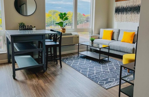 this studio apartment has everything you & your guests need to enjoy your stay in minneapolis! the bedroom has a sliding door that can be closed, but one of the walls does not reach the ceiling at the top and is open to the living area (see photos) in the kitchen, you'll find beautiful appliances, a keurig coffee maker, and basic cookware to cook simple meals for a cozy night in! there's free wifi!