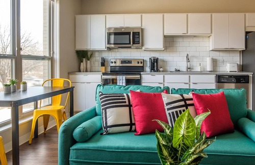 Frontdesk | Stylish 1BR Apt Near Theater is located in Ames. Frontdesk | Stylish 1BR Apt Near Theater provides accommodation, featuring Bedding/Linens, Child Friendly, Kitchen, among other amenities. This Apartment features Bedding/Linens, Child Friendly, Kitchen, to make your stay a comfortable one.