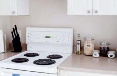 this unit is equipped with a full range of toiletries, including shampoo, conditioner, body soap, and hand soap Each guest receives one hand towel and one body towel. Additional features include a hair dryer, q-tips, and cotton rounds. The full kitchen includes a stove, fridge, microwave, toaster, kettle, coffee machine, and French press. Cooking and serving ware, including children's plastic serving ware, are provided. Basic cooking ingredients such as salt, pepper, sugar, and canola oil, as well as basic breakfast items like oatmeal, coffee, coffee whitener, and tea, are also included. The building offers a shared coin laundry room, with $2 per load for the washer and $2 per load for the dryer.