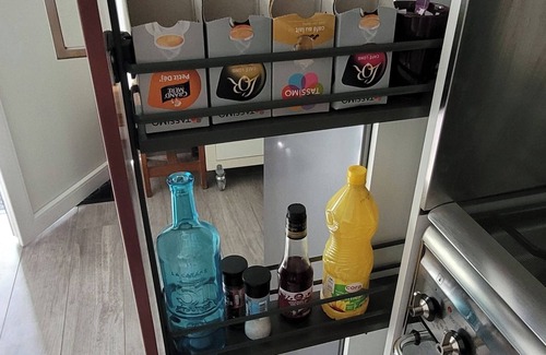 this 2-bedroom, 1-bathroom rental features a dining area, a bbq grill, air conditioning, and a desk Bathroom amenities include a hair dryer, towels, and toilet paper. The kitchen is equipped with an oven, a refrigerator, and a dishwasher, as well as a coffee maker, an electric kettle, and an ice maker.