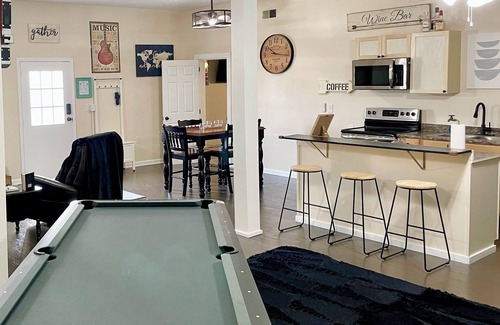 This 2-bedroom apartment is perfect for your escape to Bardstown. Nestled in the heart of the city, this enchanting property offers a fabulous retreat for guests. With a king and queen bed, you'll find comfort and relaxation in every corner. Immerse yourself in the fun amenities including pool table, arcade games, golf green, basketball, WiFi, and more! Allow us to host your stay while Experiencing the Bourbon Capital of the World! Kids are welcome too!.
