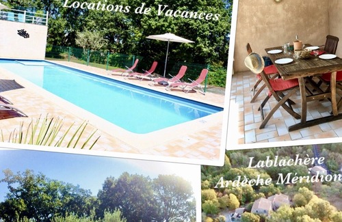 In a very quiet and rural setting, with meadow and cows in front of the property, you will relax on the edge of a pleasant swimming pool of 4X12m which has 3 levels of bath: basin babies 50cm, 125cm and 185cm, and a solarium terrace overlooking it. Our 3 cottages - Mulberry, Oak and Olive - constitute a single large villa type Provencal, located on more than 2000m2 of enclosed land with trees, and are perfectly independent: terrace, barbecue, green spaces ... Only the pool is to share. Maximum 4 people can occupy each cottage, consisting of a living room open kitchen, a bathroom and a separate toilet, and 2 bedrooms duplex (1 bed 140 + 2 bunk beds 90). Large terrace with garden furniture in exotic wood and barbecue. WIRELESS. Flat screen TV 90cm. Petanque. Cot and high chair on request. Option rent of sheets (10 € big bed 5 € small bed) to be agreed during our exchanges and to be regulated on the spot. All amenities nearby in the village of Lablachère: Sunday morning market, shops, restaurants, aquatic center, pharmacy, doctor, laundry ... The municipality of Lablachère, located in the south of the Ardèche, is adjacent to the medieval town of Joyeuse and allows many activities in a radius of less than 30km: visit villages of character (Vogüé, Balazuc, Banne, Vallon Pont d 'Arc ...), hiking, canoeing down the gorges of the Ardèche and Chassezac, Cave Pont d'Arc (Grotte Chauvet), markets and local produce etc ... See you soon ! Anne & Florian.