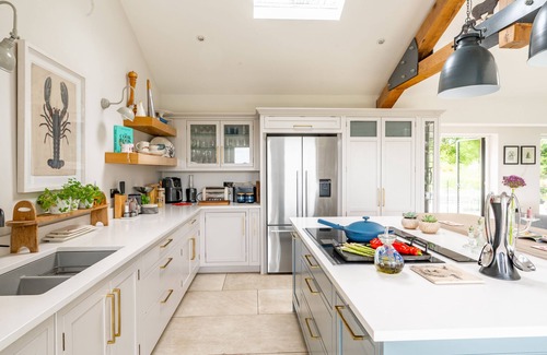 the open-plan living space enjoys double doors at the back, which open out onto a bridge over the ground floor light well, and lead you to the large entertaining terrace Here, there is an outdoor dining table for eight guests, a sofa and armchair with a coffee table, and sun loungers. From terrace, guests can enjoy use of the outdoor cooking area, with both gas and charcoal barbecues, a pizza oven and a fire pit. The terrace is surrounded by flowers, and the lawned garden behind leads you onto the woodland paths where you can take a stroll and enjoy a picnic.