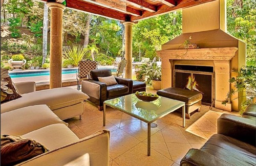 This house' offers the finest in quality and design. Grand two story entry leads to step down living room with vaulted ceilings and fireplace, large media room with fireplace. Formal dining room boasts coffered ceiling, and fireplace. The state of the art kitchen offers top of the line appliances,granite countertops and large eat-in area. Two family bedroom suites plus romantic master with fireplace,vaulted ceiling and wonderful morning sun room. All rooms lead out to beautiful gardens, fountains and a private heated pool, spa and outside sauna. The outdoor living room w/fireplace is perfect for special dining.This property backs the Santa Monica Conservancy which offers hiking trails and nature walks. All the comforts of home to include WII, X box, books and toys! Vacation or live like a celebrity in the celebrity community! Stays more then 21 days pay the utilities (gas, water and electricity).