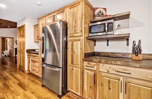 interior features include: rustic, private, log cabin surrounded by nature Full kitchen equipped with all essentials, large dining room table (seats 8), comfortable living room, and plenty of space to spread out. The home offers a Keurig coffee maker and there are two TVs to stream your favorite entertainment.