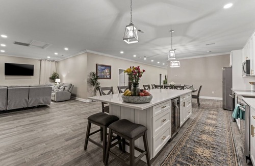 This newly remodeled interior home has spacious 10' ceilings and elegant finishes. Each room includes high end mattresses, spacious closets, drawers, ceiling fan and their own 50" Samsung television. The living room is filled with cozy recliners for you to enjoy. The kitchen has a big quartz island for everyone to gather around and a big counter space for you to place your items while your cook. The master room has its own full bathroom w/ tub and the other 4 bedrooms share two full bathrooms, one with tub and the other with a shower. Lastly, the home has a large washer and dryer for the family to quickly get clean clothe..