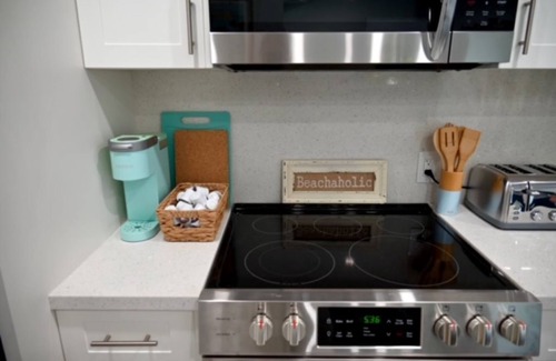 inside, you'll find a fully equipped kitchen with all the essentials you need to cook your own meals, a comfortable living area with a queen-sized sofa bed and flat-screen tv A spacious bedroom with a comfortable queen-sized bed fully equipped with a flat-screen TV, custom closet, safe, and luggage rack. The modern bathroom is fully stocked with towels and basic toiletries, as well as an overhead Bluetooth speaker. The convenient laundry room is located off of the bedroom with a washer/dryer, small counter, iron, steamer and ironing board, as well as basic laundry and cleaning essentials.