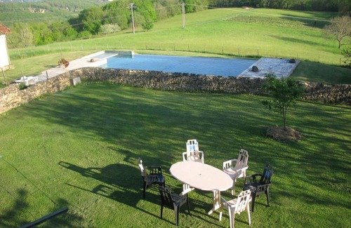You will appreciate the authentic character of this house with its exposed stones and beams, its "cantou" style fireplace in Dordogne blond stone, the large living room of 40m², its private garden of 200m² to take meals while contemplating the view, without forgetting its large tiled swimming pool of 110m² and 150m3 (shared with 3 other Gîtes de France) allowing you to swim well while contemplating the landscape thanks to its infinity length (unheated swimming pool). Semi-detached house to unoccupied buildings, not far from the 3 other gites not overlooked. On the ground floor: living room with kitchen area. Upstairs, 3 bedrooms including one with 1 bed 160 and a shower room and a toilet, then a bedroom with 1 bed 140 and one with 2 beds 90. A shower room with double sinks, bidet and shower. A toilet. Central underfloor heating. Land. 4 km from the village of Beynac and Cazenac (classified among the most beautiful villages in France), this large stone house of 120m², an old restored 18th century farm, in a dominant position, benefits from a beautiful panorama.
